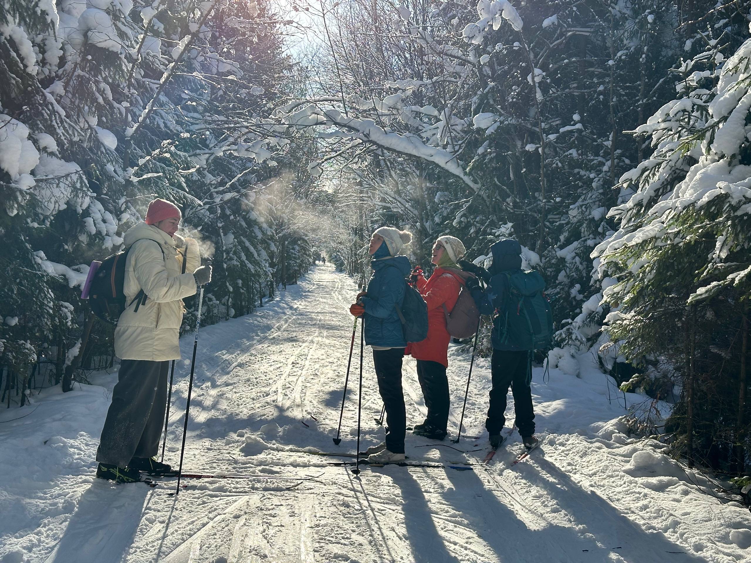 Потрясающий маршрут и компания! Заснеженный лес, на который я редко поднимала голову, так как чаще смотрела под ноги😁. На лыжи встала первый раз. Анастасия провела инструктаж, показала основные приемы и мы пошли. В конце я уже съезжала с горок. Так же мы вышли на лыжную трассу Охта парка и там тоже прокатились по лыжне. День завершила теплым бассейном на открытом воздухе. Это был офигенный выезд в классной компании. Пить чай на морозе прекрасно. Погода наградила солнцем. Фотографии получились изумительные. Спасибо девчонкам за компанию и Насте за чуткое и внимательное отношение и прекрасную организацию 🩷😘 Уже выбираю поход на лето 😁